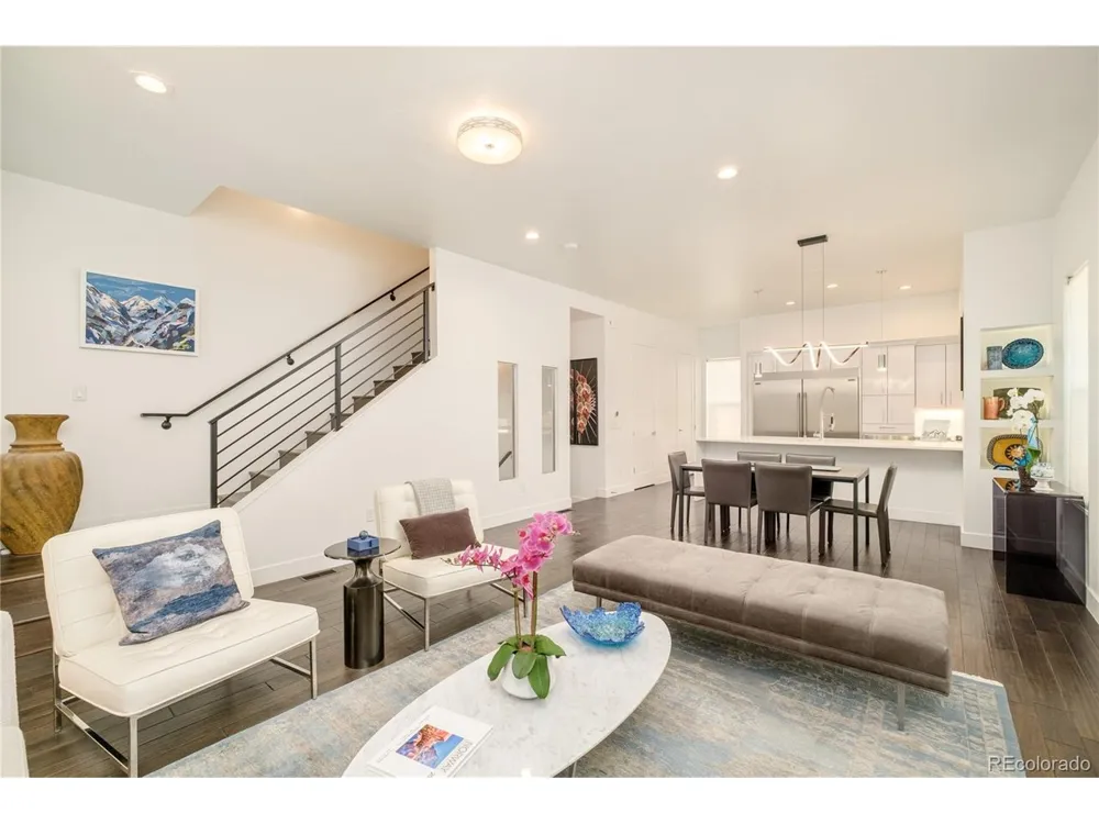 This immaculate end unit tells a story of light, space, and sweeping mountain views. Four en-suite bedrooms, five baths, and a floor plan wider than most-designed for the way you actually live. The entry level welcomes you with a versatile bedroom or den featuring an electric fireplace, wet bar, walk-in closet, and direct access to a generous 10x15 patio. Upstairs, the main level unfolds into an open great room where the kitchen takes center stage: a 64" double-wide refrigerator, high-gloss cabinetry, quartz countertops, and a 36" Italian range that commands attention. Dining and living spaces flow effortlessly, accented by designer lighting and a statement fireplace. A sun-drenched ensuite bedroom-ideal as a home office-completes this level. The top residential floor is home to the primary suite, a private sanctuary with balcony, walk-in closet with custom built-ins, and a spa-inspired bath finished in marble tile. A guest suite and laundry round out the level. Throughout, you'll find hardwood floors and Level 4 hand-trowel wall finishes-details that elevate the everyday. Crowning it all, a rooftop deck offers sweeping mountain views and space to entertain or simply breathe, prepped for a hot tub and built for Colorado living. An attached two-car garage with epoxy flooring and storage cabinets completes the home. In close proximity to City Park, City Park Golf Course, Denver Zoo and RINO with fabulous local amenities, this is modern Denver at its finest. The home is awesome as a primary residence and is an easy lock-and-leave option for those who travel on a regular basis. Buyer to verify square footage and schools. Furniture is negotiable.