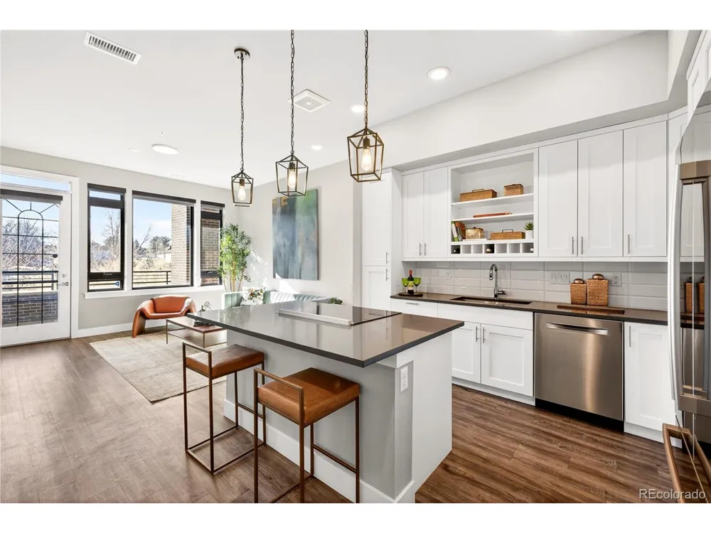 Modern Lowry living at Boulevard One. This light-filled 1-bedroom + den, 2-bath condominium offers nearly 1,000 square feet of thoughtfully designed, single-level living in one of Denver's most sought-after neighborhoods. Built in 2020, the home features 10' ceilings, floor-to-ceiling windows, and a desirable southern exposure that fills the space with natural light throughout the day with expansive views. The open kitchen is finished with sleek quartz countertops, contemporary tile backsplash, soft-close cabinetry, and a full Bosch appliance package including induction cooking-perfect for both everyday living and entertaining. Premium slide out shelves added in the kitchen. The spacious primary suite includes a walk-in closet and a beautifully appointed bath, while the additional den and second bathroom provide flexible space for guests, a home office, or media room. Enjoy indoor-outdoor living with a covered patio, one of the largest in the building with unobstructed views of the community park. The patio features an added, upgraded storm and security door. Additional highlights include central A/C, smart thermostat, in-unit washer and dryer, double-pane windows, elevator access, and underground, tandem parking space with your own EV charger. The HOA is professionally managed and comprehensive, covering building insurance, exterior maintenance, elevator service, landscaped grounds, secure access, and long-term capital reserves-reducing unpredictable ownership costs and eliminating major future expenses. The HOA is financially strong and secure with significant reserves. Ideally located between Crestmoor Park and the shops and restaurants of Boulevard One, with easy access to Cherry Creek, and downtown Denver. A rare opportunity for modern design, convenience, and low-maintenance living in the heart of Lowry.